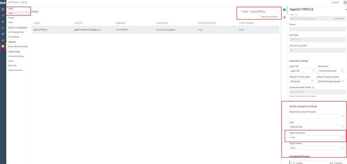 8. In the Side Panel under Quality management settings make sure the previously configured supervisor (e.g fr oci) is set as Supervisor for the current user.
