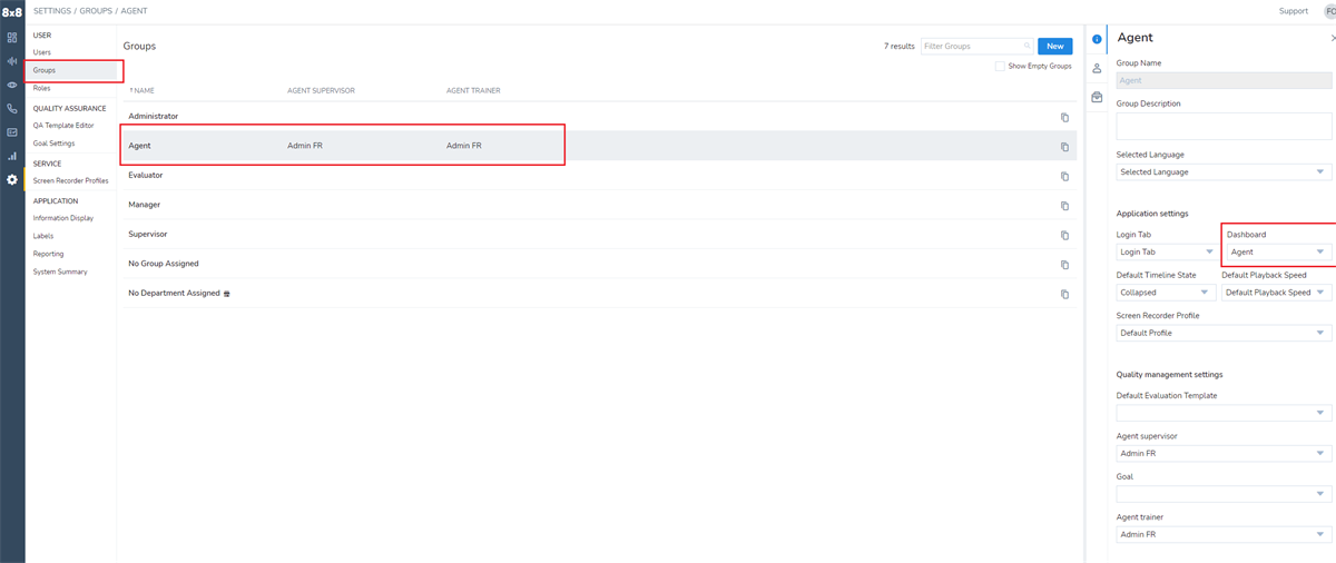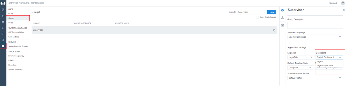 5. Click the group (e.g Supervisor) and select a Dashboard from Side Panel under the Application settings section (e.g Agent supervisor)