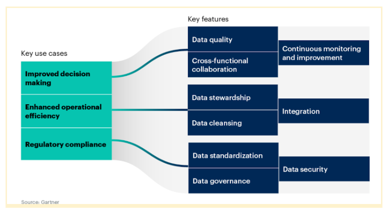The Technology & Services Industry Association (TSIA) identifies companies' biggest struggle is producing and leveraging quality data. Without this clean, reliable data, you cannot obtain thematic insights, proactive guidance, or strategic empowerment. Gartner's chart from Market Guide for Master Data Management Solutions illustrates how data management can enable diverse solutions, which is necessary to implement a successful and dependable bot.