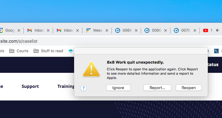 Tried tech support without any real ideas. Uninstalled, clean new install, same problem. "8x8 Work quit unexpectedly." Kind of an older Mac but not ancient, same thing happens if I try to re-open. Tech support told me to talk to my own 'IT department' or try it on a different computer. Any other ideas?